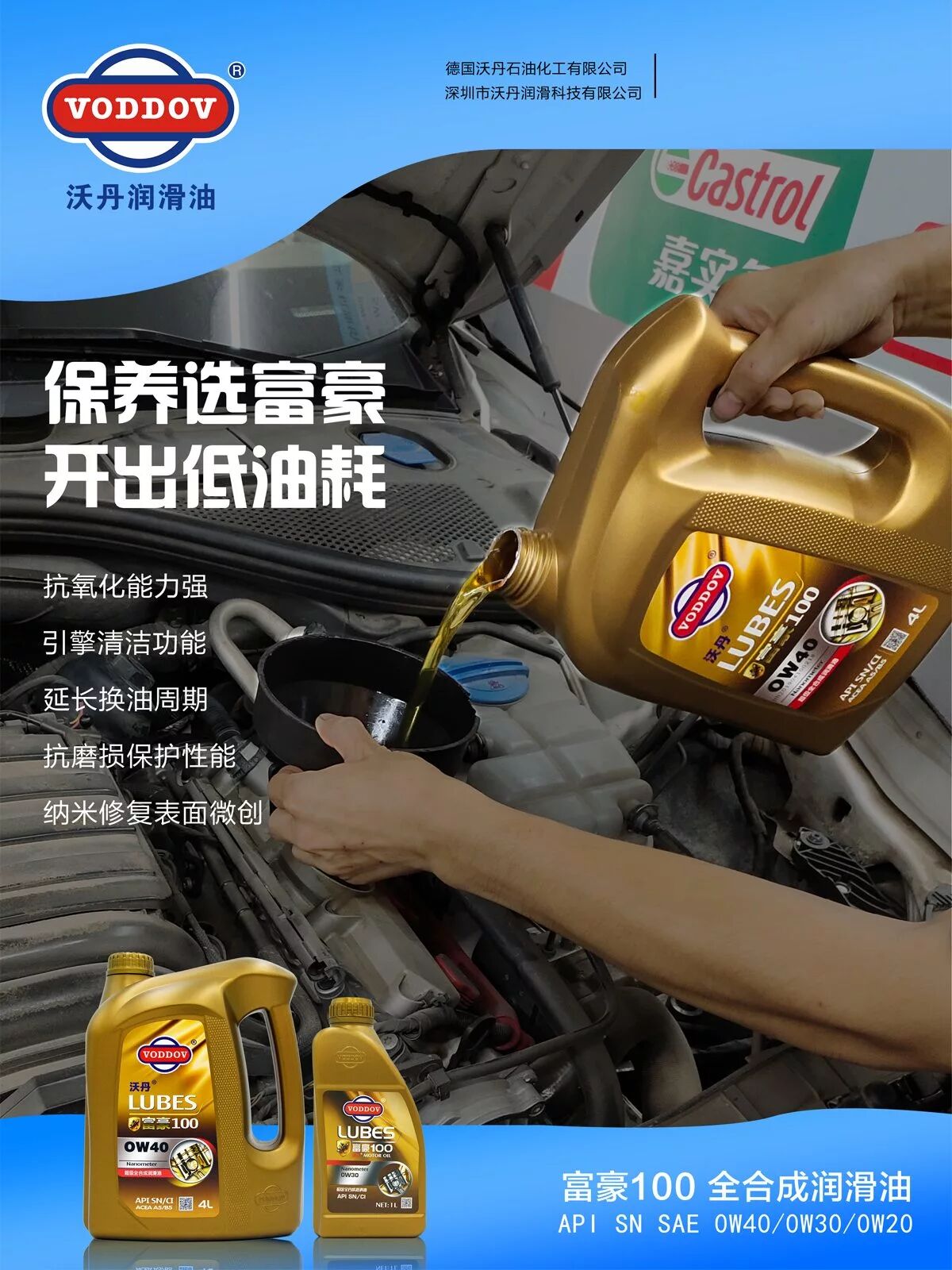 4、发动机汽缸内部不干净、有沉积的积碳(那么你需要用到沃丹富豪100,全合成机油,纳米修复因子、提速快、噪音低、成模快、液压稳、动力强劲、机油损耗少。)